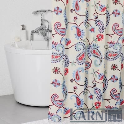 Занавеска из 100% полиэстера для ванны с 12 металлическими люверсами под кольца. Штора обработана специальной пропиткой, отталкивающей воду.