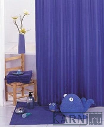Занавеска из 100% полиэстера для ванны с 12 металлическими люверсами под кольца. Цвет: темно-синий. Штора обработана специальной пропиткой, отталкивающей воду. Внизу по всей длине вшит шнур-утяжелитель.