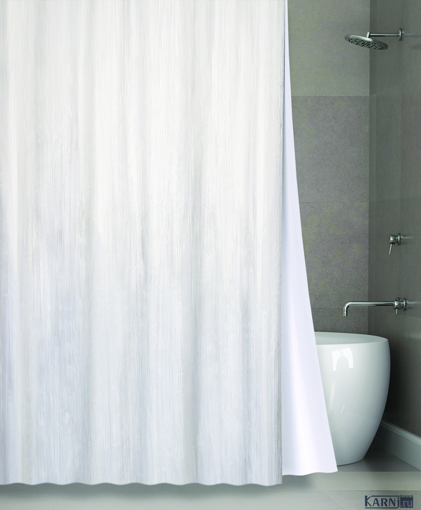 Двухслойная штора для ванны с 12 металлическими люверсами под кольца. Снаружи цветная штора из органзы, внутренняя штора - клеенка ПВХ для защиты от влаги. Цвет: сама штора белая/клеенка белая полупрозрачная.