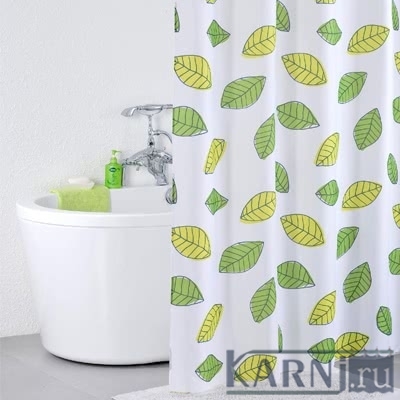 Занавеска из 100% полиэстера для ванны с 12 металлическими люверсами под кольца. Штора обработана специальной пропиткой, отталкивающей воду.